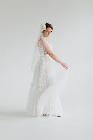 Bridal gown with intricate lace design under a tulle layer. Lace bodice and flowy skirt. (does have a bolero not included in pictures) Lace back fits sizes 2-8.