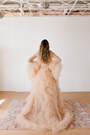 Flowy and fluffy sheer robe in a peach color and tulle belt. beige slip dress is available with the robe.